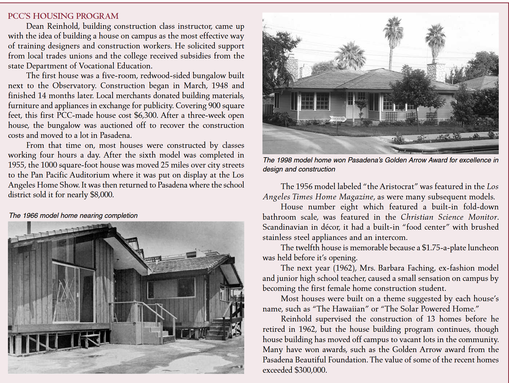 Launched in 1948 by Dean Reinhold, a construction class instructor, this program provided an opportunity for students to build a home on campus. Reinhold felt that this would be the most effective way of training both designers and those in the construction trades. With support from local trade unitons and subsidies from the State Department of Vocational Education, students began construction of their first five-room, redwood-sided bungalow next to the campus in March of 1948. Students and Reinhold went on to build 13 homes before the instructor retired in 1962. In this collection one will find photos of the program during Reinhold's leadership. The program has continued by the actual construction after Reinhold left moved to vacant lots in the community.
